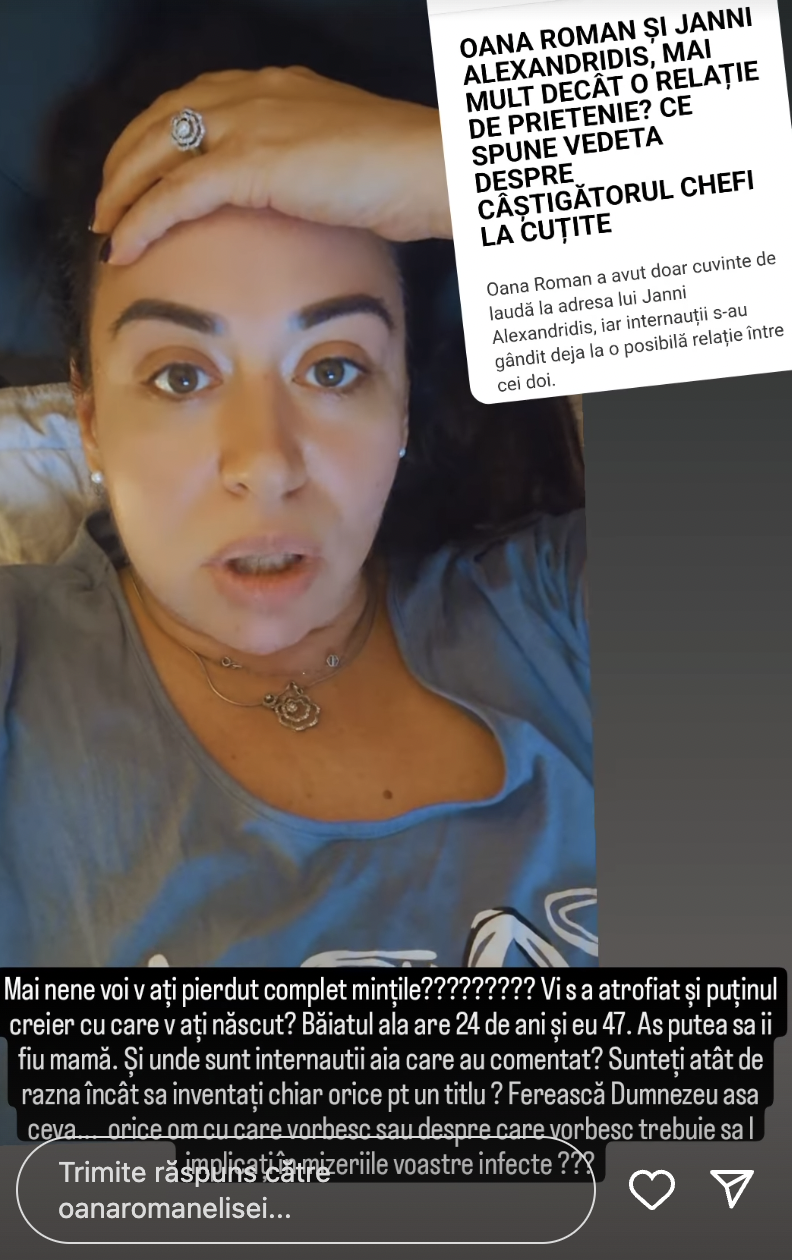 Oana Roman a abordat situație tranșant, fără să stea la negocieri sau să caute scuze. Vedeta a spus clar și răspicat faptul că informația este total eronată și că între ea și Janni Alexandridis nu există niciun fel de legătură în afară de cea de prietenie, invocând, printre altele, diferența de vârstă majoră care