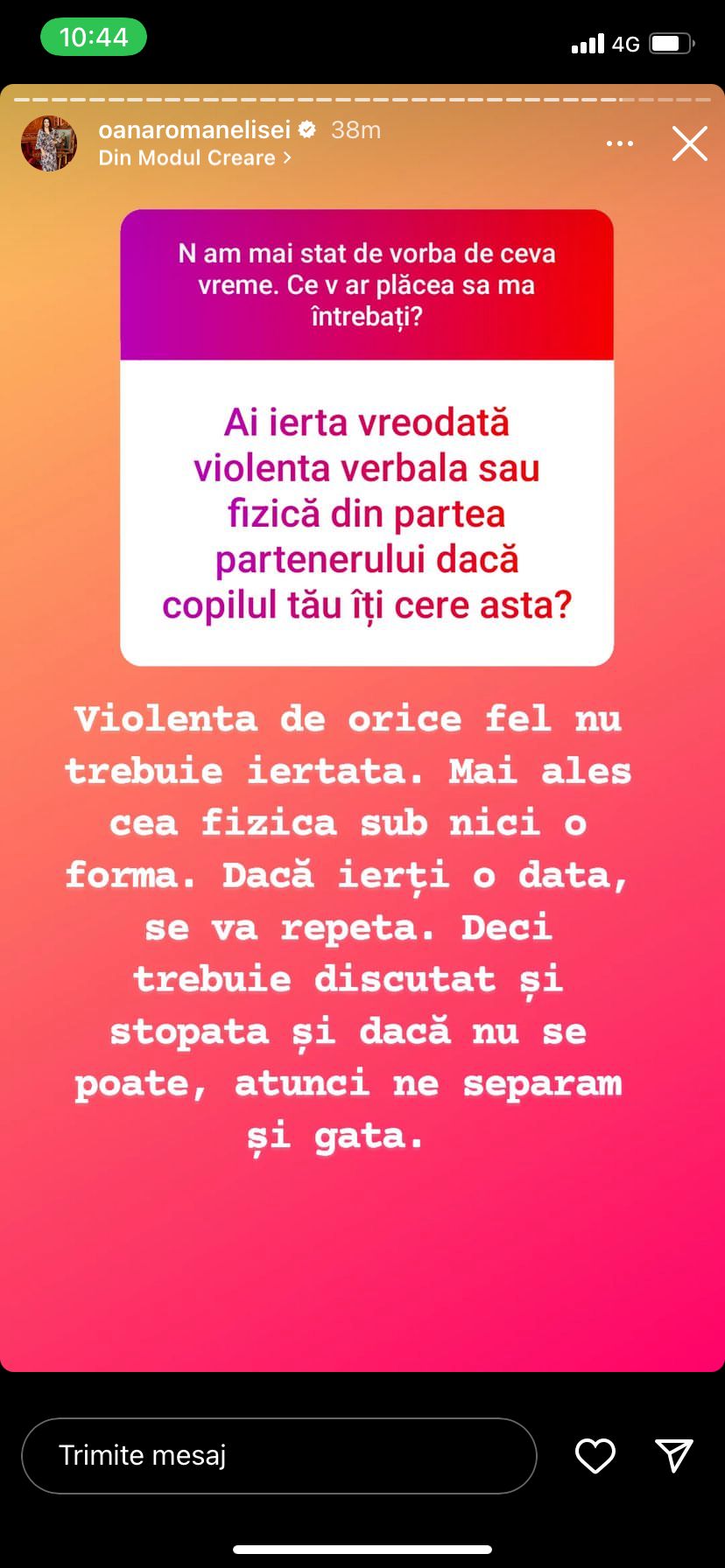 „Violența de orice fel nu trebuie iertată. Mai ales cea fizică sub nicio formă. Dacă ierți o dată, se va repeta. Deci trebuie discutat și stopată, și dacă nu se poate, atunci ne separăm și gata”, a fost răspunsul Oanei Roman.