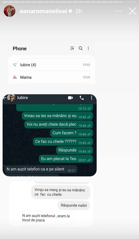 Fiica lui Petre Roman a explicat că, înainte de a pleca de acasă, aceasta i-a scris partenerului de viață, pentru a-l întreba cum procedează cu cheile, conștientă fiind că Marius și fiica sa nu vor avea cum intra în locuință. Din nefericire, Marius Elisei nu a răspuns la telefon, dar nici la mesaje, iar Oana Roman a demonstrat acest lucru prin câteva capturi de ecran.