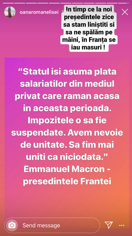 În continuare, Oana Roman a publicat pe pagina ei de Instagram și un mesaj pe care l-a trasnmis Emmanuel Macron, președintele Franței. „Statul își asumă plata salariaților din mediul privat care rămân acasă în această perioadă. Impozitele o să fie suspendate. Avem nevoie de unitate. Să fim mai uniți ca niciodată”, le-ar fi transmis el cetățenilor din Franța.