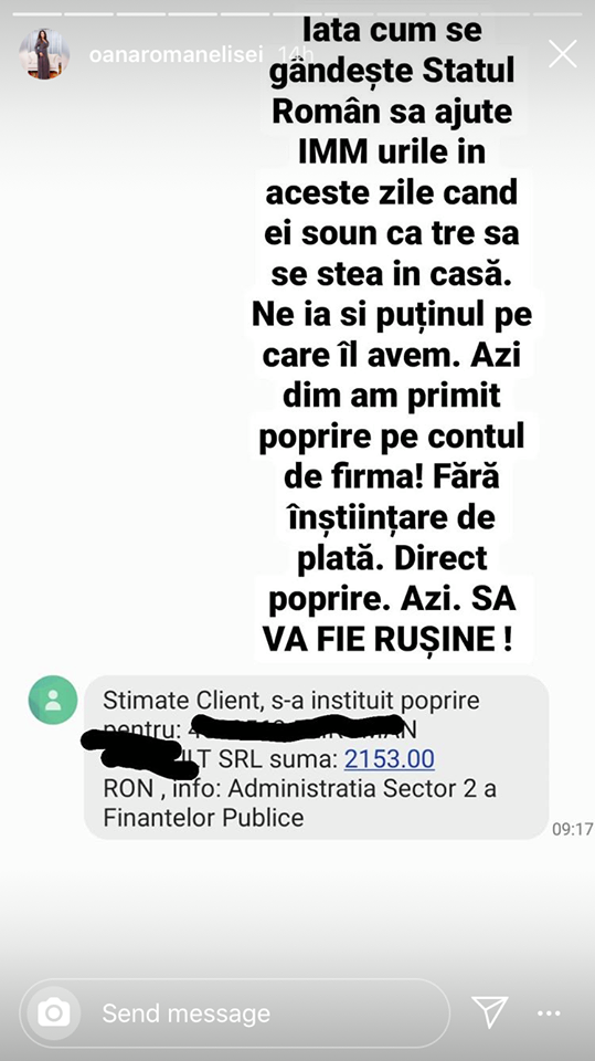 „Iată cum se gândește statul român să ajute IMM-urile (n.r. – Întreprinderi Micro, Mici şi Mijlocii) în aceste zile când ei spun că trebuie să se stea în casă. Ne ia și puținul pe care îl avem. Azi dimineață am primit poprire pe contul de firmă! Fără înștiințare de plată. Direct poprire. Azi. SĂ VĂ FIE RUȘINE!”, a scris vedeta pe internet.