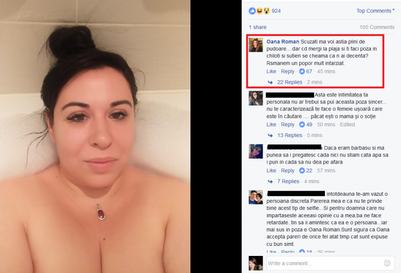 Prietenii de pe Facebook au comentat si au spus ca nu e o ipostaza care sa o reprezinte si ca ar trebui sa pastreze pentru sine imaginile de ganul acesta.