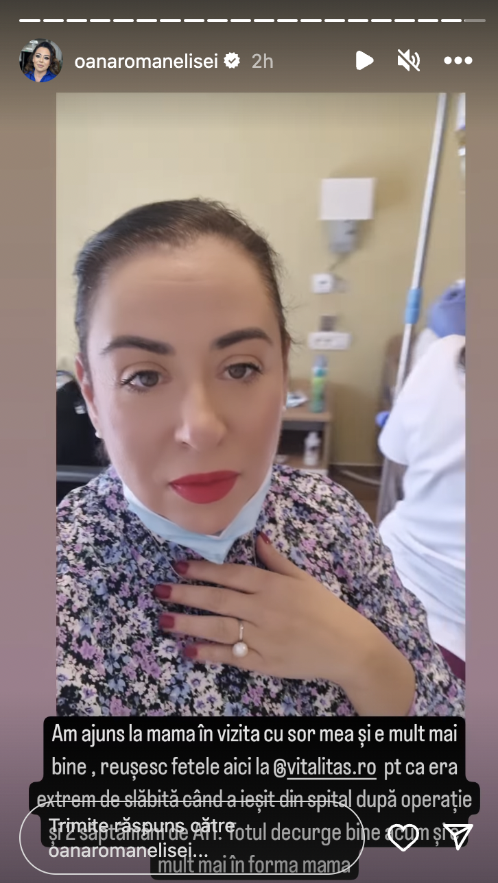 „Am ajuns la mama în vizită cu sora mea și e mult mai bine, reușesc fetele aici, pentru că era extrem de slăbită când a ieșit din spital după operație și două săptămâni de ATI. Totul decurge bine acum și e mult mai în formă mama.”, a spus Oana Roman în mediul online.