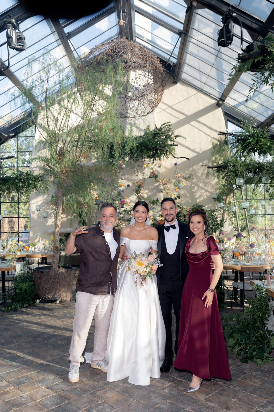 O nuntă ca într-un vis al unei nopți de vară, într-o seră în inima padurii, în care cei aproape 160 de invitați să danseze până dimineața alături de doi miri zâmbitori, emoționați și fericiți și de nașii lor, Anca Sigartău și Dragoș Pandele.