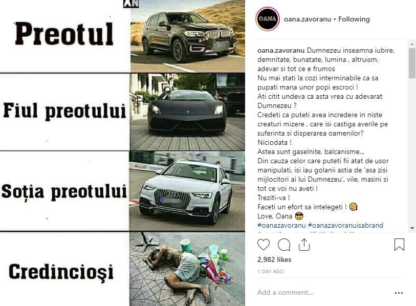Oana Zăvoranu este una dintre cele mai directe persoane publice din România. Bruneta nu ezită să îşi spună părerile nici măcar atunci când ceilalţi nu sunt de acord cu ea şi ar putea intra în conflicte. Deşi multe dintre mesajele ei de pe reţelele de socializare sunt opinii controversate şi care dau naştere la tot felul de discuţii cu internaiţii, de data aceasta ea a publicat o declaraţie de dragoste superbă pentru soţul ei.