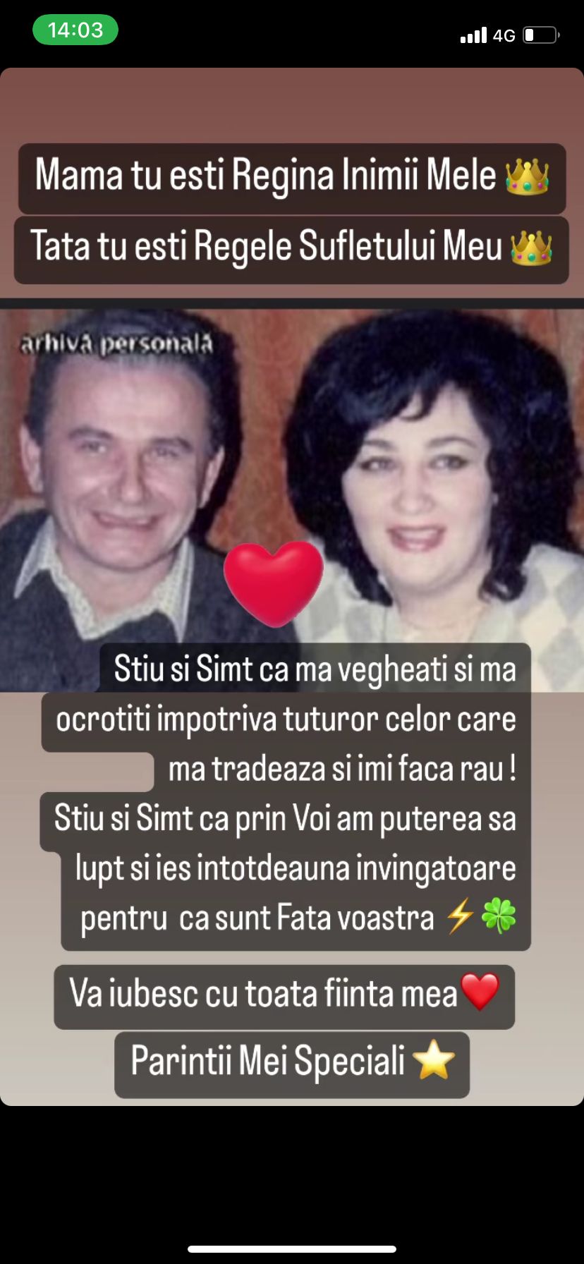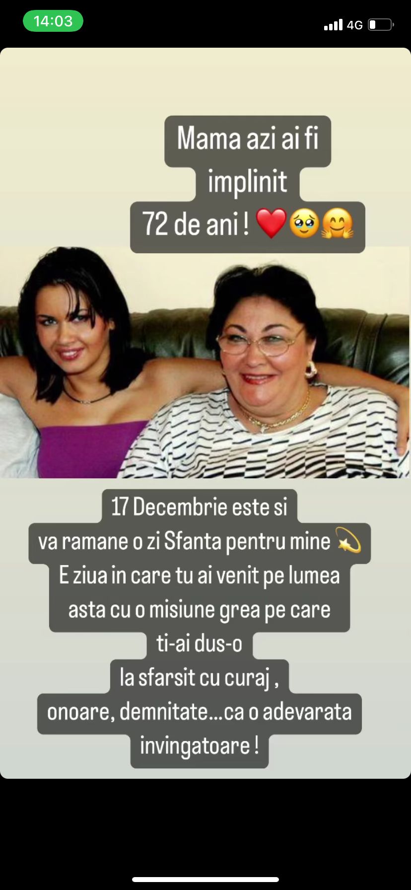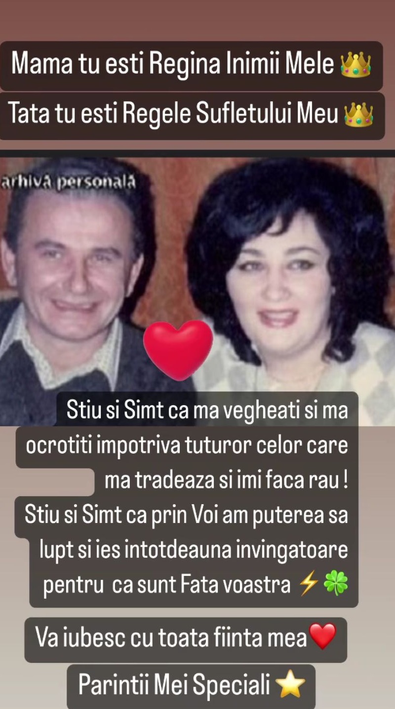 „Mama azi ai fi împlinit 72 de ani. 17 decembrie este și va rămâne o si sfântă pentru mine. E ziua în care tu ai venit pe lumea asta cu o misiune grea, pe care ți-ai dus-o la sfârșit cu curaj, onoare, demnitate… ca o adevărată învingătoare. Te iubesc, mama! Mulțumesc că m-ai ocrotit cât ai trăit, mi-ai vegheat copilăria, m-ai învățat să fiu un om de onoare și m-ai adus pe lume un suflet cald, onest și puternic. Mama, tu ești regina inimii mele. Tata, tu ești regele sufletului meu. Știu și simt că mă vegheați și mă ocrotiți împotriva tuturor celor care mă trădează și îmi fac rău! Știu și simt că prin voi am puterea să lupt și ies întotdeauna învingătoare pentru că sunt fata voastră. Vă iubesc cu toată ființa mea. Părinții mei speciali.”, este mesaj pe care Oana Zăvoranu l-a scris pe rețelele de socializare, pentru mama sa.