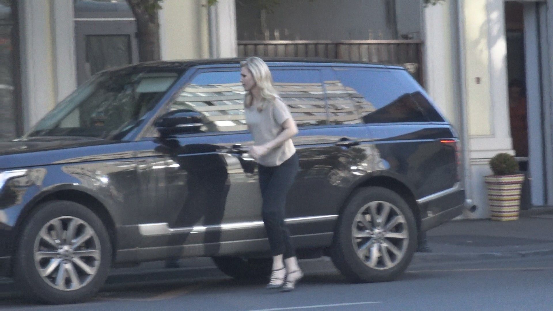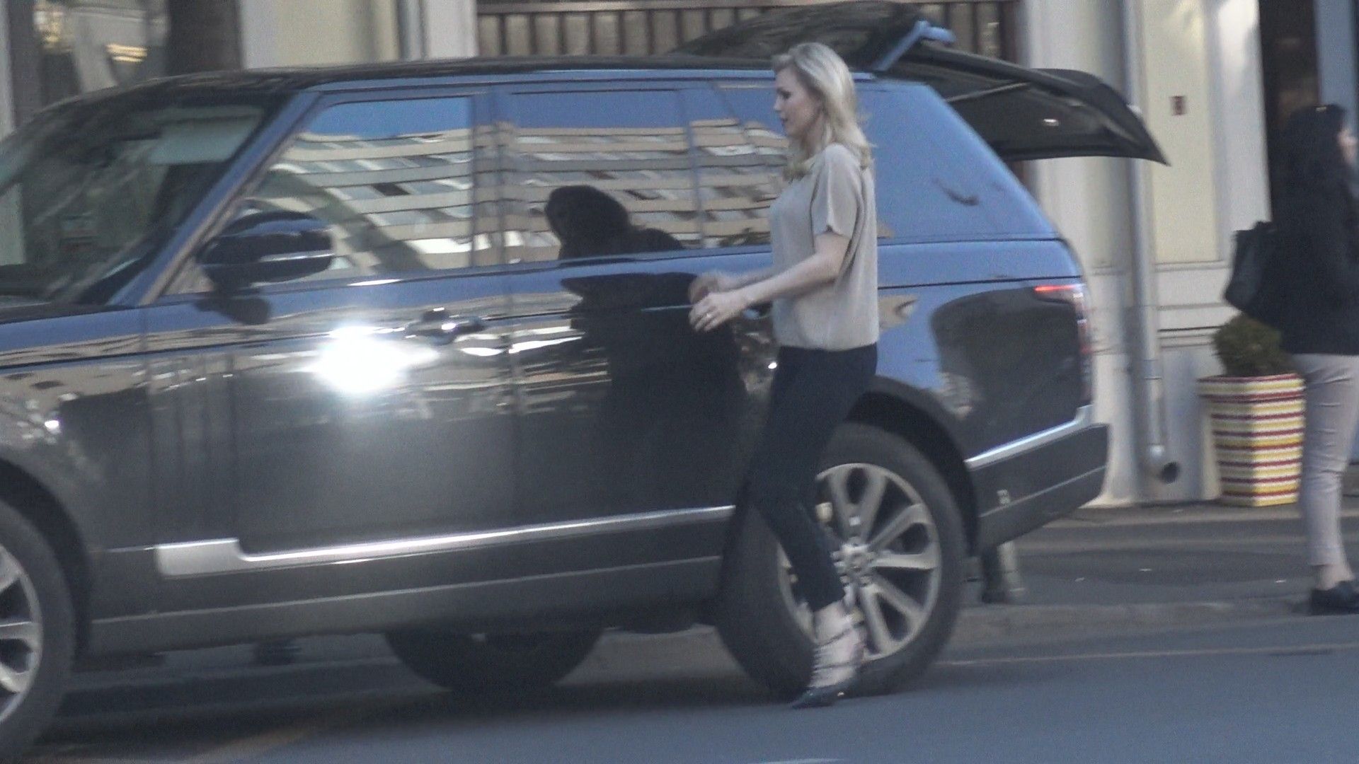 Cel mai probabil, blonda se pregatea de onorarea unui eveniment in weekend, iesind de la curatatorie cu trei umerase pe care atarnau trei rochii elegante.