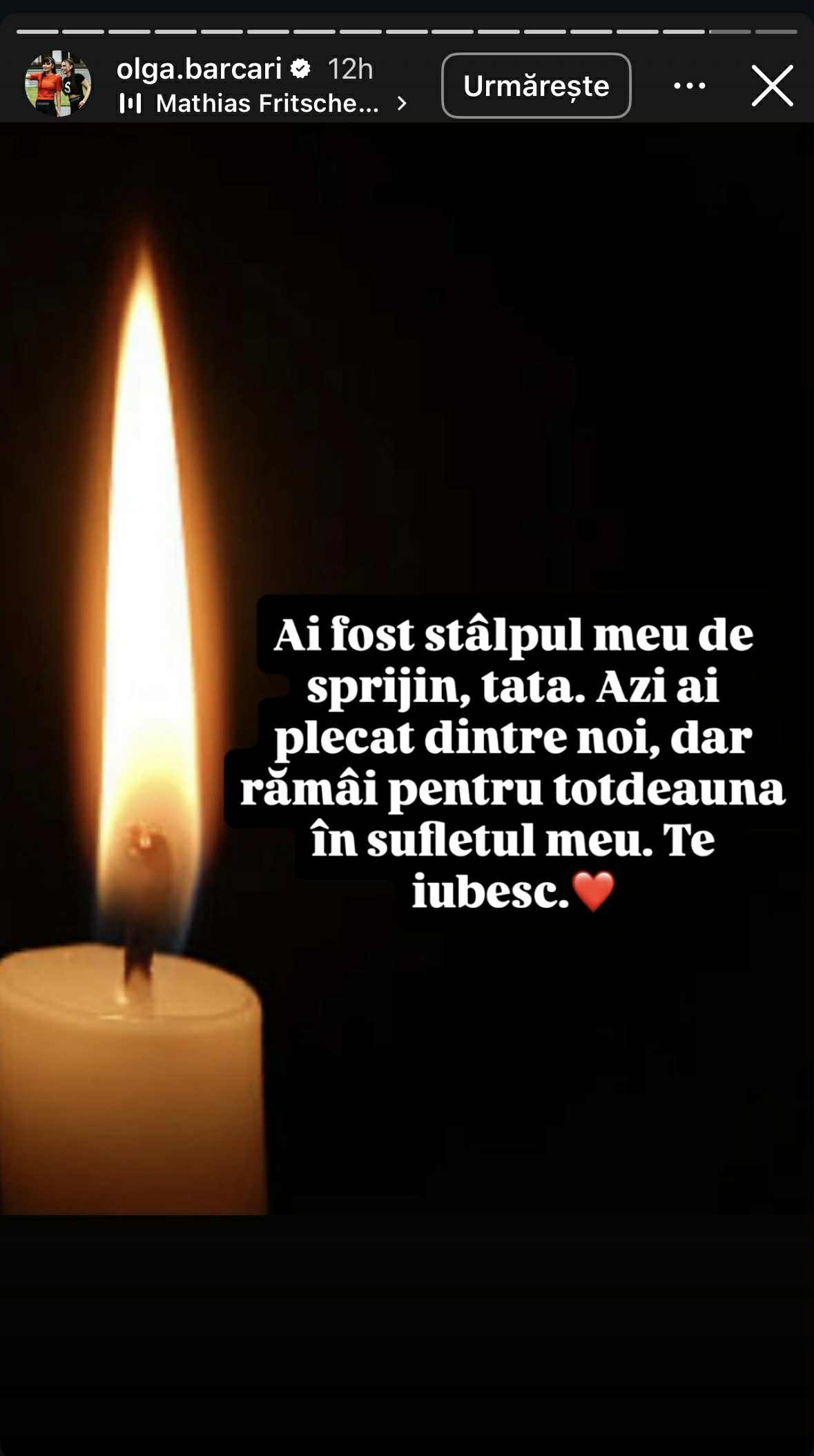 Noaptea trecută, Olga Barcari a anunțat, printr-o postare pe Instagram, că tatăl ei a încetat din viață. Alături de o imagine cu o lumânare aprinsă, a transmis un mesaj sfâșietor, mărturisind că își va purta părintele mereu în suflet.