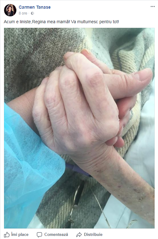 “Acum e liniste, Regina mea mama! Va multumesc pentru tot!”, a scris Carmen Tanase in dreptul imaginii.