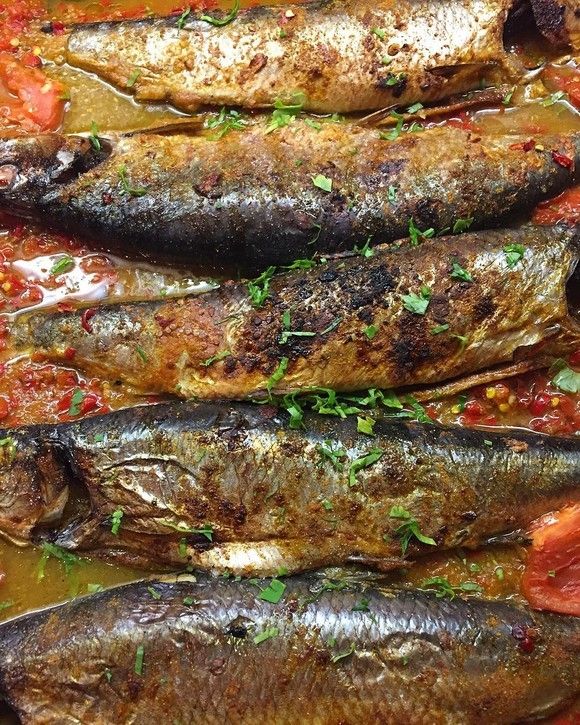 Ea a pregatit scrumbie de mare la cuptor, cu sos de curry, rosii si ardei gras.