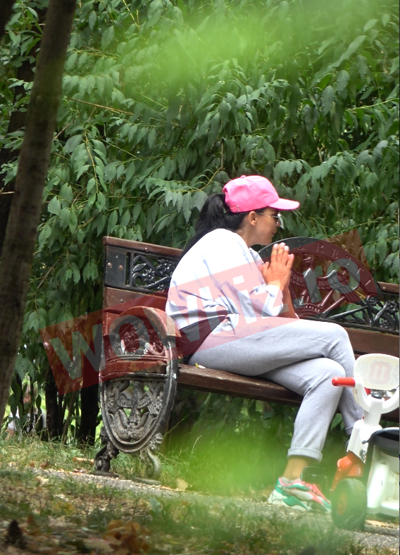 Îmbrăcată lejer, cu un trening gri și o șapcă roz, vedeta și-a scos fiul în parc. A stat pe bancă, a mâncat sticksuri și a mai vorbit cu o prietenă, timp în care copilul său s-a jucat liniștit.