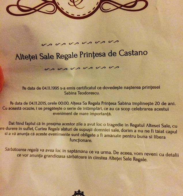 Sabina Teodorescu a implinit ieri 20 de ani, iar parintii sai, Oreste si Liliana, ii pregatisera o petrecere surpriza intr-un club din Bucuresti. Din cauza tragediei din Colectiv, Oreste si sotia sa au compus o scrisoare prin care au anuntat ca evenimentul s-a amanat pentru saptamana viitoare. „Altetei sale regale, Printesa de Castano. Pe data de 04.11.1995 s-a emis certificatul ce dovedeste nasterea printesei Sabina Teodorescu. Pe data de 04.11.2015, orele 00:00, Altesa Sa Regala Printesa Sabina implineste 20 de ani.