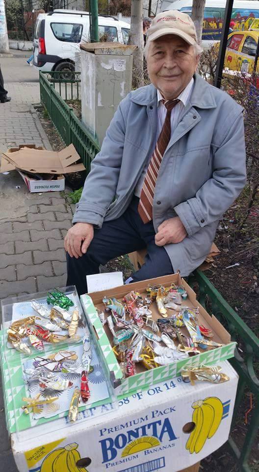 „Buna dimineata oameni cu inima curata ! Am descoperit ca in Rahova exista un domn , un batranel ce confectioneaza sandale din materiale reciclabile pe care le vinde cu doar 2 lei. Pensia lui fiind ” imensa ” , a ales sa se faca util astfel. Va rog , daca treceti pe langa el nu il ocoliti. S ar bucura sa stie ca sandalele lui sunt purtate de cineva.