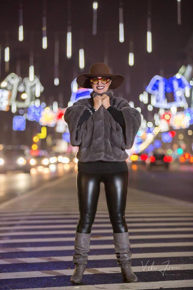 Pentru shootingul sau, ea a ales sa poarte o hainuta moderna de blana, pe care a asortat-o cu o pereche de colanti, stransi pe picior.