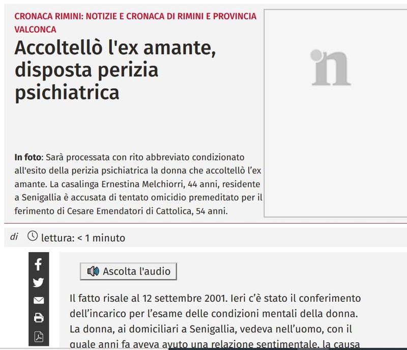 În anul 2001, publicația italian NewsRimini scria despre un anume Cesare E. din localitatea Cattolica, pe atunci în vârstă de 52 de ani, care a fost înjunghiat de o femeie. Cei doi avuseseră o relație romantică cu mai mulți ani în urmă, iar femeia făcuse o obsesie din faptul că Cesare a ruinat-o din punct de vedere financiar.