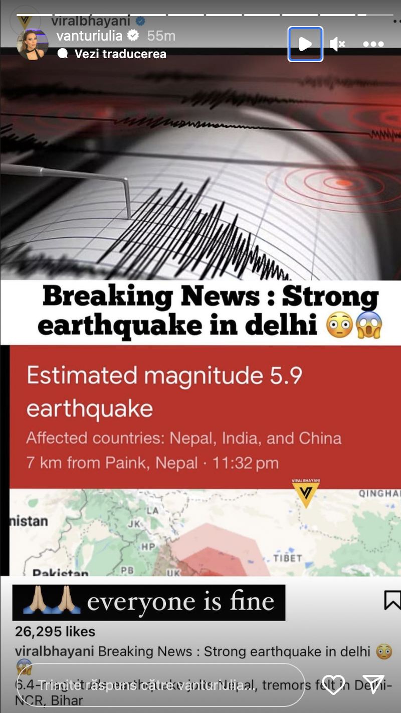 În urmă cu puțin timp a avut loc un cutremur cu magnitudinea de 6,4 care s-a desfășurat în India, China și Nepal. Iulia Vântur se află în aceste momente în Dubai, însă îngrijorarea a fost la cote maxime în momentul în care a aflat că seismul s-a simțit puternic în Delhi, India, în zona în care se află iubitul său și familia acestuia. Printr-un mesaj postat în mediul online, fosta prezentatoare TV a anunțat că toată lumea este în afara oricărui pericol în urma cutremurului.