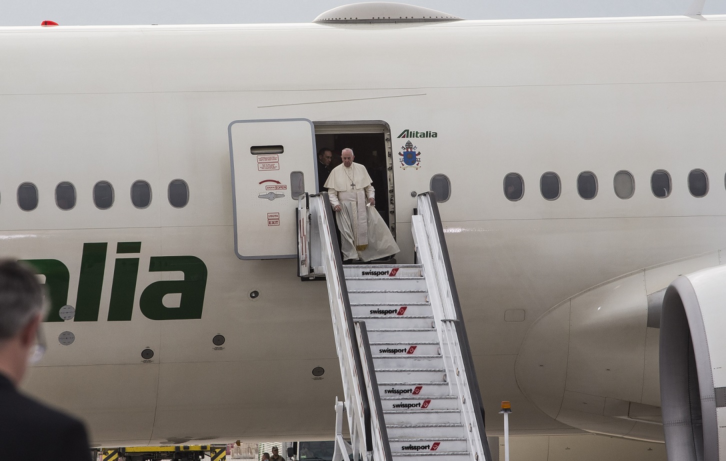 Papa în România 2019. Papa Francisc obisnuiește să ia cu el în cabina avionului geanta personală, în care are mereu agenda, o carte, breviarul și aparatul de ras. Sunt lucruri pe care le are aproape de el în orice călătorie.
