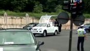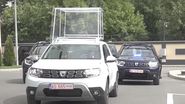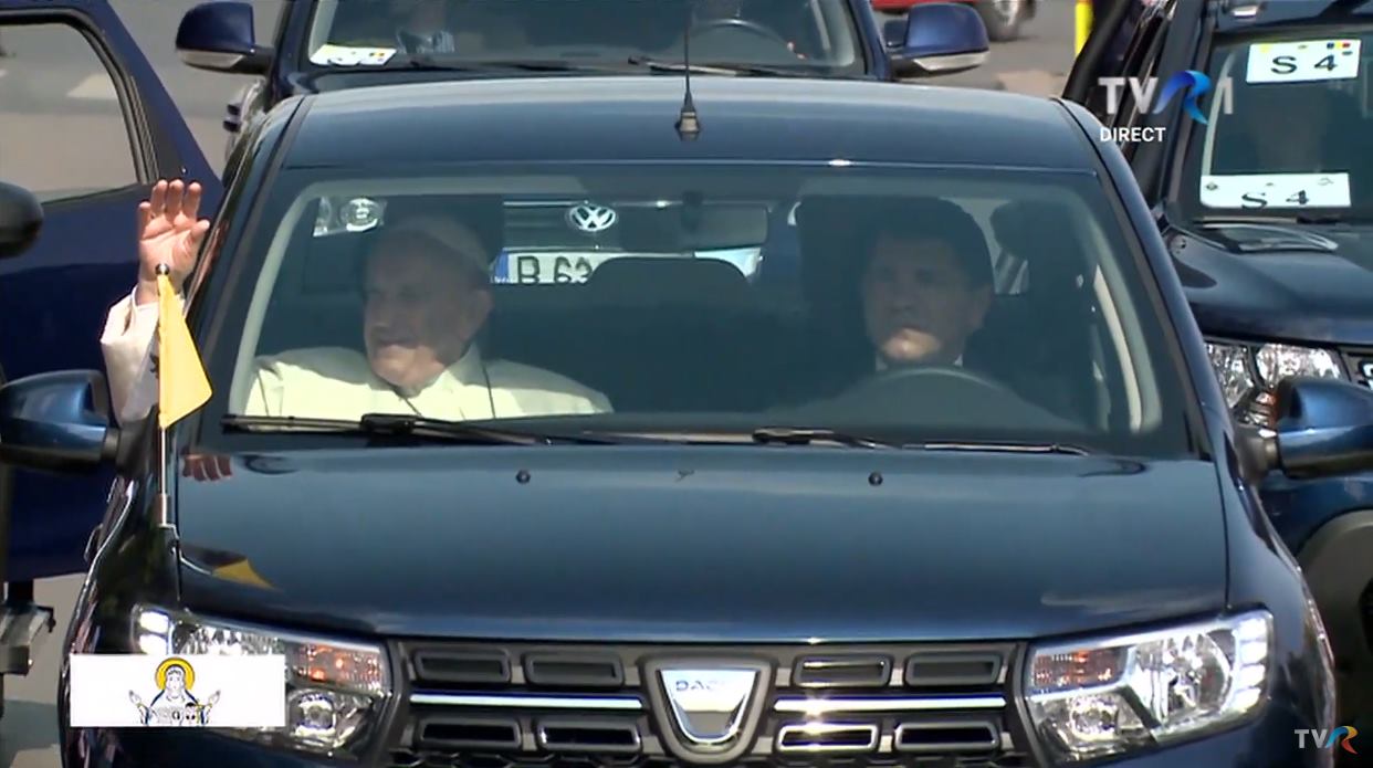 Papa în România 2019. Papa a folosit Papamobilul la plecarea de la Catedrala Mântuirii Neamului. Până acum, el a folosit pentru deplasare un automobil Dacia Logan.