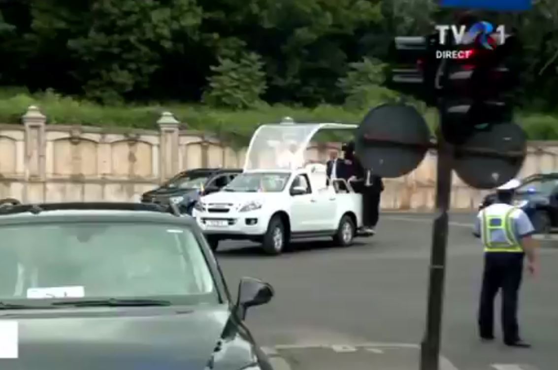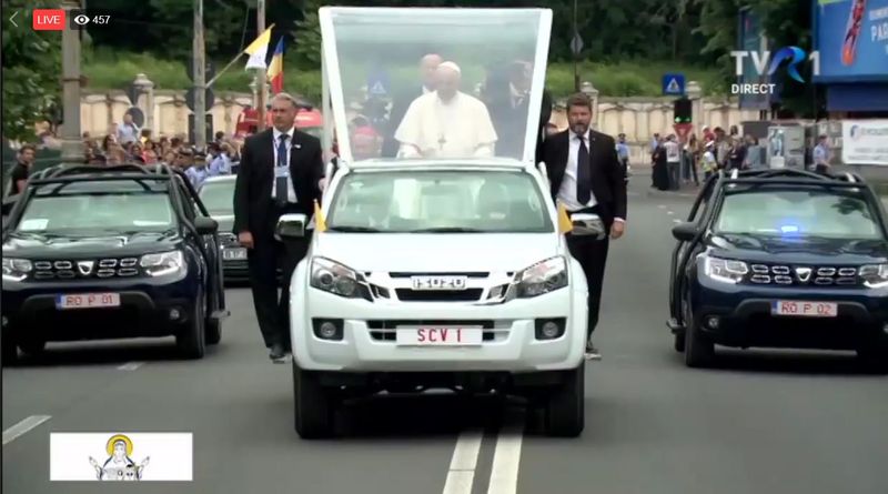 Papa în România 2019. Surpriză de proporții, în timpul vizitei lui Papa Francisc în România. Papamobilul românesc nu a mai fost folosit de către Suveranul Ponitf în timp ce acesta s-a deplasat pe străzile din București. Pentru această deplasare s-a preferat un autmobil creat de compania japoneză Isuzu.