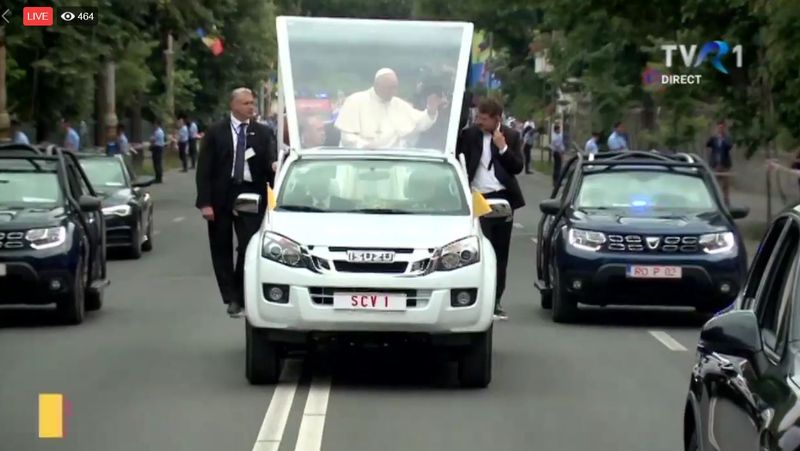 Papa în România 2019. Papa Francisc nu a mai urcat în Papamobilul de fabricație autohtonă și a preferat unul creat de compania japoneză Isuzu.