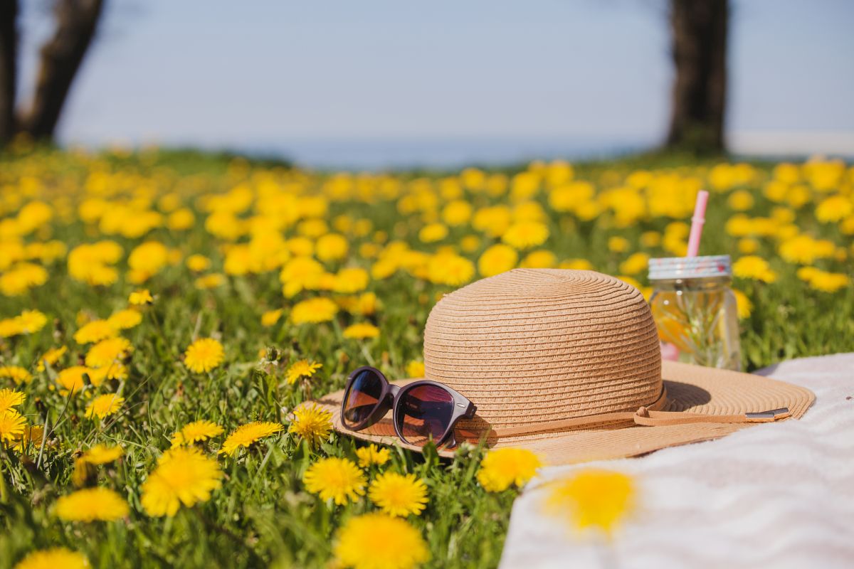 Pălăria și ochelarii de soare, esențiale în zilele caniculare, așezate pe un câmp de flori