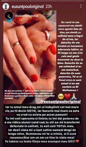 „De când te-am cunoscut am simțit ceva aparte față de tine, am simțit că sufletul meu e legat de al tău, iar datorită ție am învățat ce înseamnă adevărata iubire, să fii lângă un om și în cele mai grele momente, nu doar la bine. Datorită ție m-am schimbat și m-am maturizat, datorită ție sunt mai puternică, tu m-ai făcut ceea ce sunt astăzi și nu am cuvinte să îți mulțumesc! Iar tu, omul meu drag, mi-ai îndeplinit cel mai mare vis, să îți devin soție, iar bucurie mai mare ca asta nu cred că există pe acest pamant! Tu îmi ești speranța și liniște, tu îmi dai puterea de a mă ridica atunci când cad, tu știi să-mi transformi defectele în calități, tu ești totul meu. Iar deși viața mi-a luat câțiva oameni dragi de lângă mine, Dumnezeu mi te-a trimis și sunt recunoscătoare că am un om ca tine în viața mea! Te iubesc cu toată ființa mea scumpul meu soț!”, a scris iubita lui Paul pe instagram.