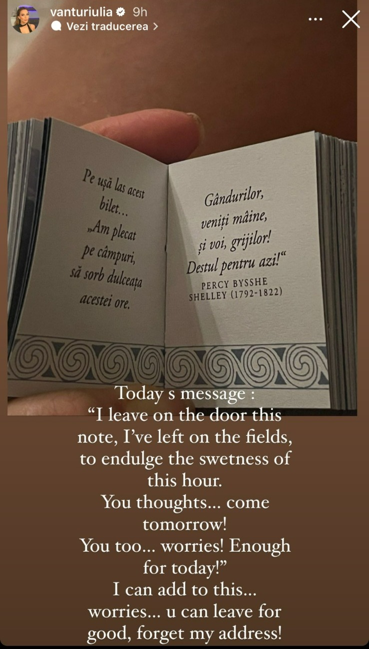 „De la mama, cu multă dragoste. Pacea Inimii (n. red. numele cărții), cea mai mică și liniștitoare carte. Pentru că e un cadou cu multă iubire, am găsit îndrumare în această carte, am deschis-o din intuiție să primesc răspunsuri”, a transmis Iulia Vântur pe pagina sa de Instagram, la secțiunea Stories.