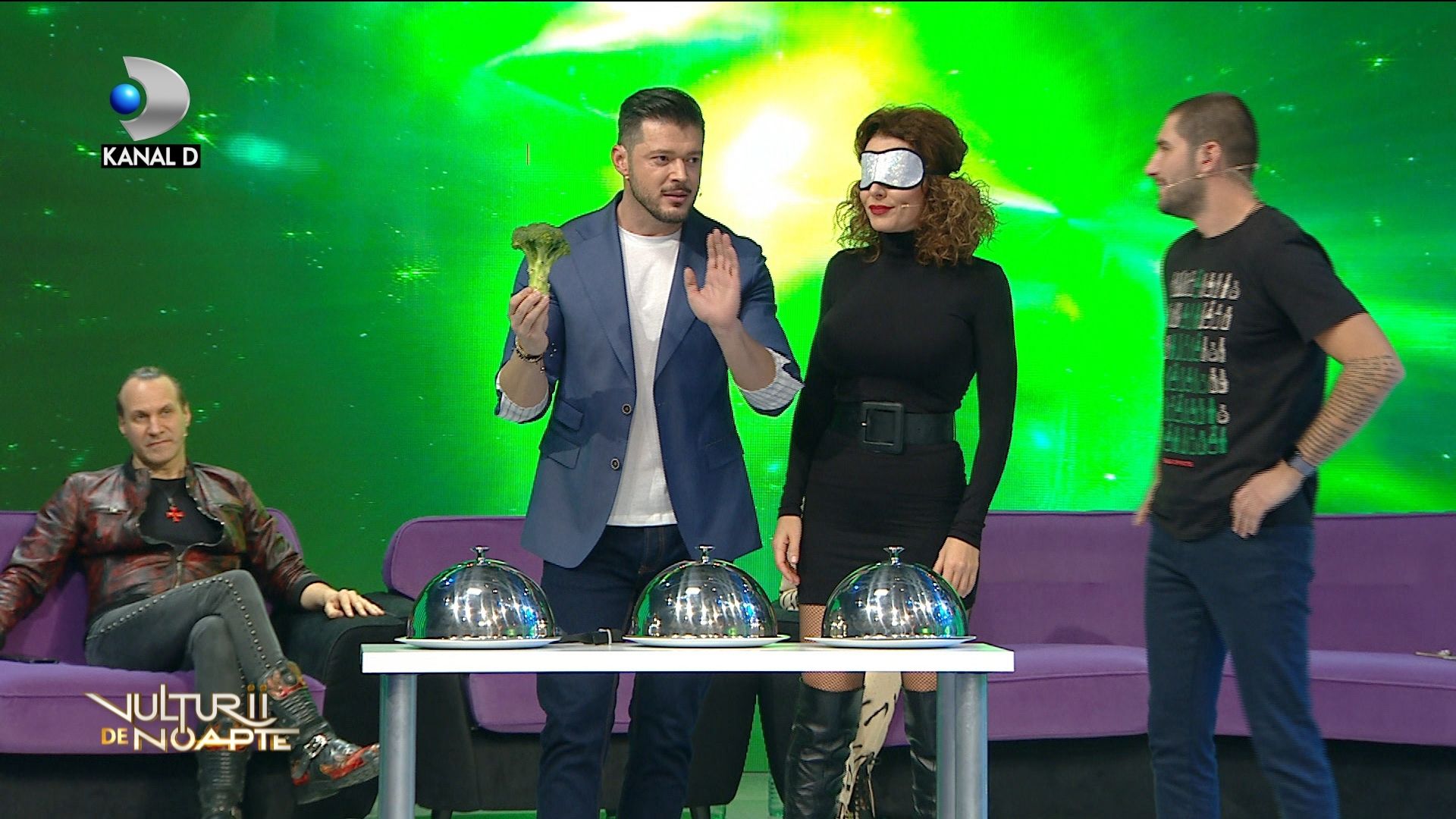 Degustare, cu masca pe ochi, in platoul emisiunii Vulturii de noapte
