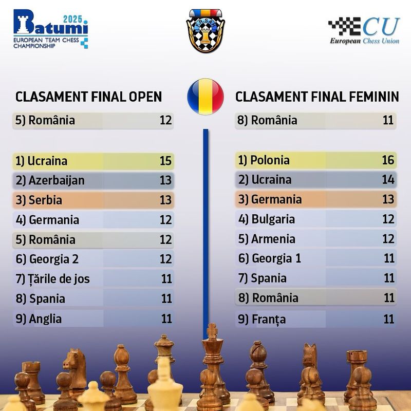 „Performanță istorică! România termină pe cea mai bună poziție din toate participările la Campionatul European de Șah pe Echipe la Open: locul 5, la egalitate cu Germania și după Ucraina, Azerbaidjan și Serbia, din 40 de