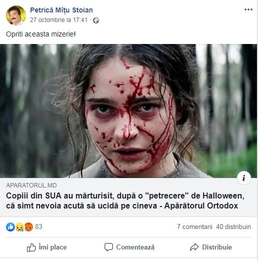 Petrică Mîţu Stoian vrea să interzică sărbătoarea de Halloween după cum au aflat amicii cântăreţului de muzică populară. Acesta a distribuit un material de pe un site intitulat „Apărătorul ortodox”, al cărui titlu este „Copiii din SUA au mărturisit după o petrecere de Halloween că simt nevoia acuta să ucidă pe cineva”. „Luaţi aminte! Opriţi această mizerie!”, a scris Mîţu Stoian. (vezi cum a jignit-o Mîţu Stoian pe Floricica Dansatoarea)
