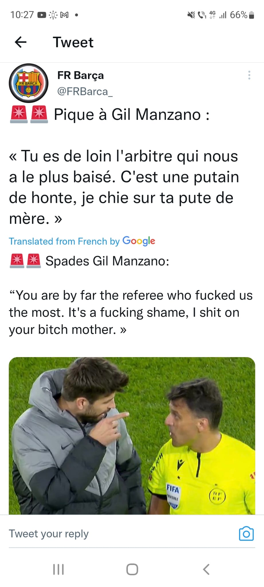 Ulterior, presa din Spania a făcut public raportul de meci al arbitrului Gil Manzano. Potrivit acestuia, Gerard Pique l-a înjurat de mamă: „După ce delegatului clubului i s-a comunicat că jucătorul a fost eliminat, jucătorul a continuat să repete aceleași expresii. A fost nevoie de intervenția celor din club pentru a fi dus la vestiare, în timp ce îmi adresa următoarele cuvinte: «E o rușine nenorocită! Mă c** pe c***a de mă-ta»”, a scris Manzano, notează sursa citată.