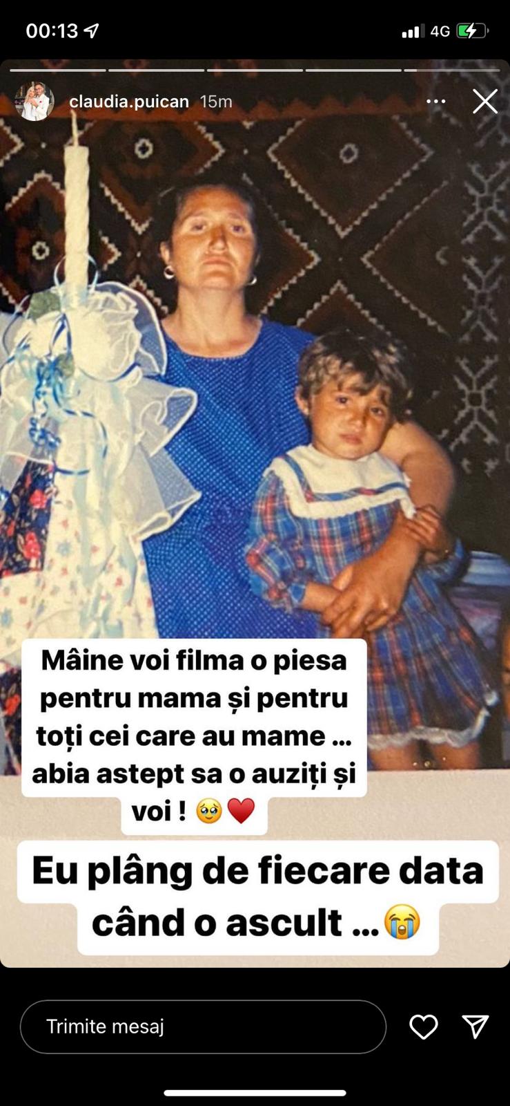 „Mâine voi filma o piesă pentru mama și pentru toți cei care au mame… abia aștept să o auziți și voi! Eu plâng de fiecare dată când o ascult…”, a scris Claudia Puican în mediul online.