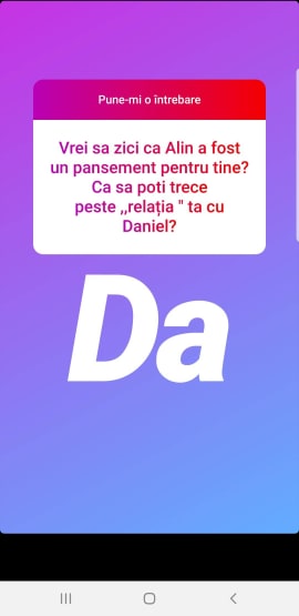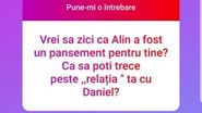 Întrebată de către fani cât timp a fost cu Alin, Plușica a răspuns: „Nu contează, nu vreau să vorbesc despre „pansamente”, apoi a recunoscut că Alin a fost doar un pansament, pentru a putea trece peste relația cu Daniel.