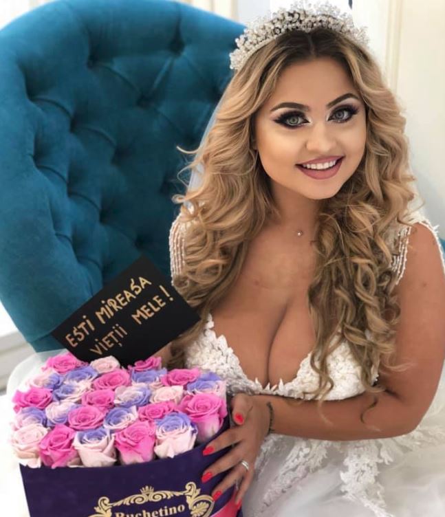 Plușica de la Puterea Dragostei a făcut senzație cu o rochie de mireasă extrem de decoltată, care i-a pus în valoare bustul spectaculos.