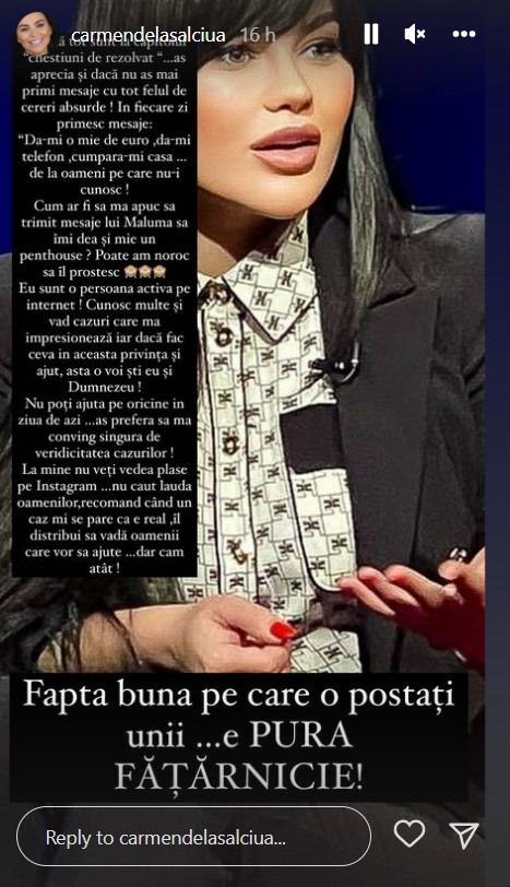 Nu poți ajuta pe oricine în ziua de astăzi... aș prefera să mă conving singură de veridicitatea cazurilor. La mine nu veți vedea plase pe Instagram... nu caut lauda oamenilor. Recomand când un caz mi se pare că este real, îl distribui să vadă oamenii care vor să ajute... dar cam atât. Fapta bună pe care o postați unii... e pură fățărnicie”, a scris Carmen de la Sălciua pe contul ei personal de Instagram.