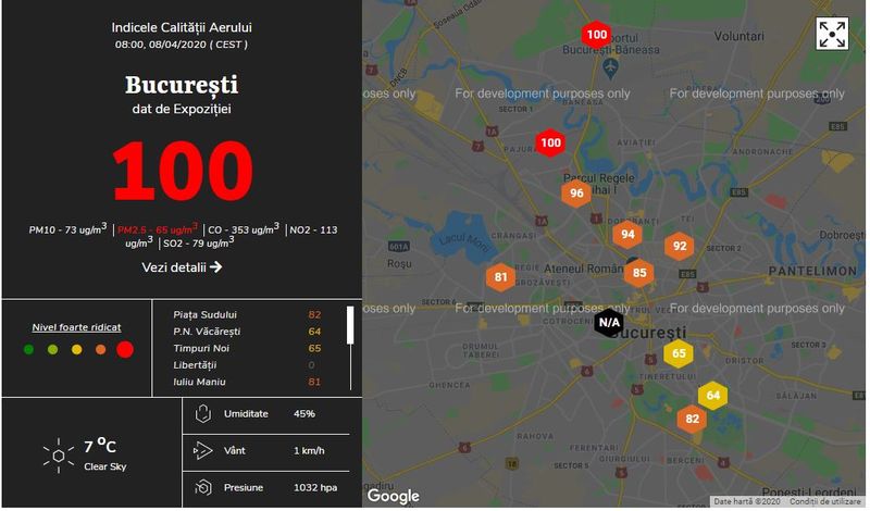 Harta celor de la Aerlive arată dimensiunile dezastrului, pentru că numeroase zone sunt ”pe roșu”, ceea ce înseamnă un nivel foarte ridicat de poluare. Inițial, ”roșu” era doar în zona Pajura, dar așa cum se poate vedea, s-a extins, iar acum s-au făcut portocalii multe alte zone, este vorba despre zona Bd Mihalache, Dorobanți, șos Ștefan cel Mare, Colentina, Moșilor, și se întinde spre Univeristate, Iuliu Maniu.( Așa arăta harta acum)