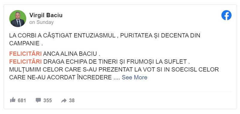 "La Corbi a câştigat entuziasmul, puritatea şi decenţa în campanie.(...) Iar eu, dragi corbeni, vreau să vă mulţumesc pentru cei opt ani petrecuţi cu voi în calitate de primar",