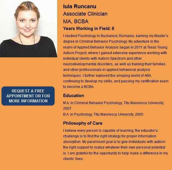 Asa a ajuns Iulia sa lucreze la un centru pentru copii bolnavi de autism din Texas. Romanca are insa spate si o diploma de master in psihologie obtinuta in Romania, in 1995.