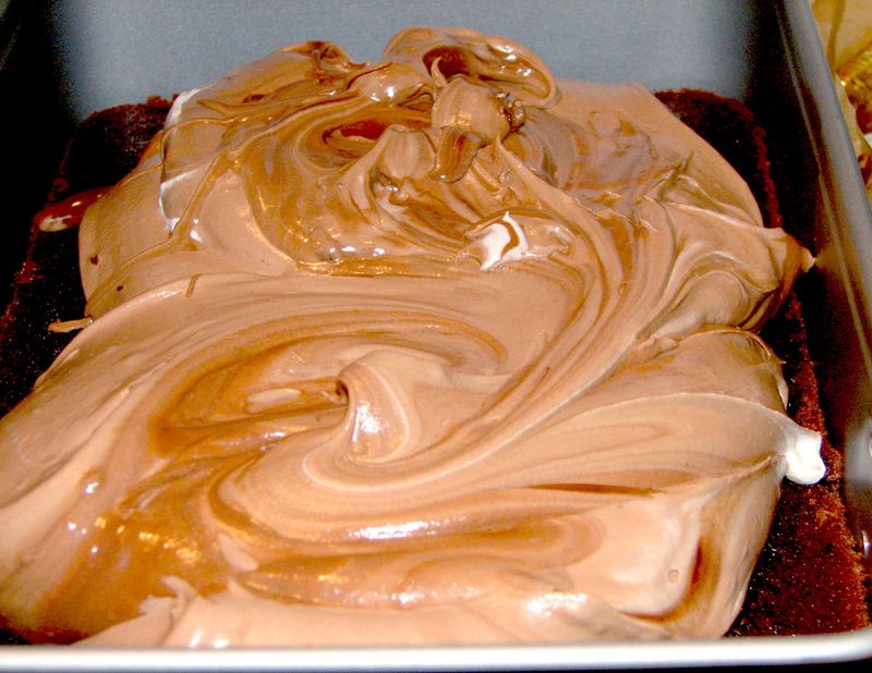 Pentru blat, se mixeaza ouale cu zaharul si un praf de sare pana isi dubleaza volumul. Se adauga untul topit , faina amestecata cu praful de copt si cacaoa si amestecam bine pana se omogenizaeaza.