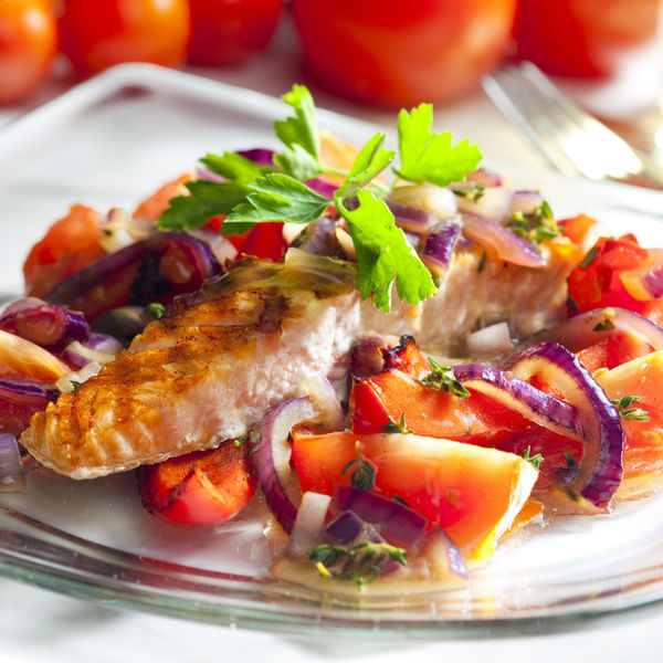 Incinge uleiul intr-o tigaie adanca. Pune pestele, apoi adauga usturoiul tocat marunt, rosiile din conserva, ardeiul gras, ceapa si asezoneaza cu sare. Toarna apa in tigaie, lasa focul mic si gateste pestele timp de 10 minute pe fiecare parte. Cand pestele s-a facut, scoate-l din tigaie si mai lasa sosul pe foc pana cand legumele sunt bine facute. Toarna apoi sosul peste platica si serveste imediat, presarat cu patrunjelul tocat.