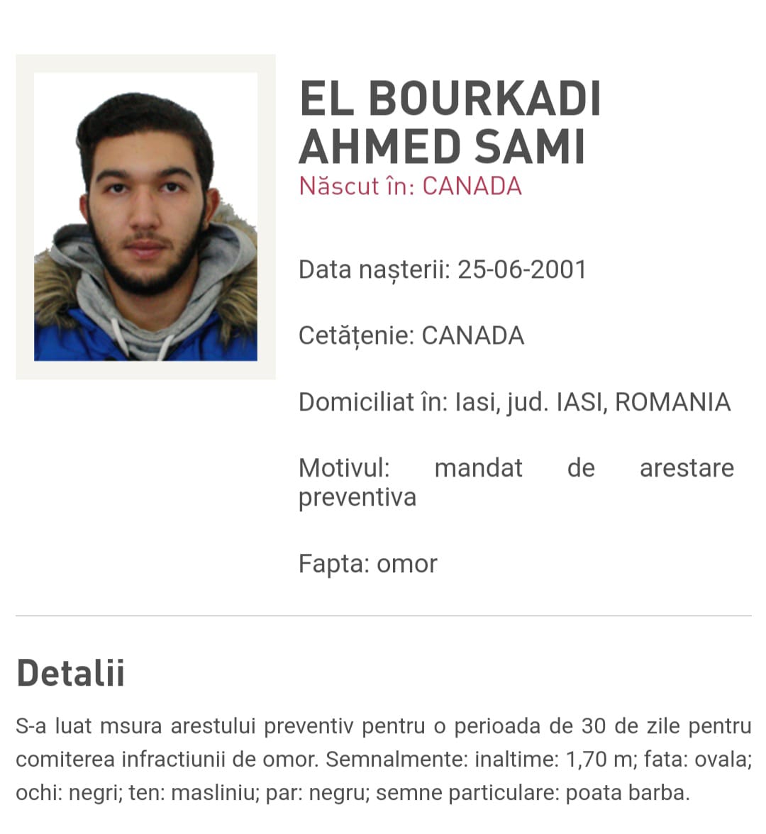 Ahmed Sami El Bourkadi, principalul suspect în dubla asasinare din Iași, a fost prins după trei zile de căutări. Tânărul de 20 de ani de origine marocană a fost prins pe străzile din Roma. Presupusul criminal ar fi cuis o tânără română de 23 de ani și pe iubitul ei în vârstă de 25 de ani, de origine marocană, amândoi fiind studenți la medicină. După ce i-a ucis pe cei doi cu sânge rece, tânărul a plecat din țară și a încercat să își „șteargă” urmele.