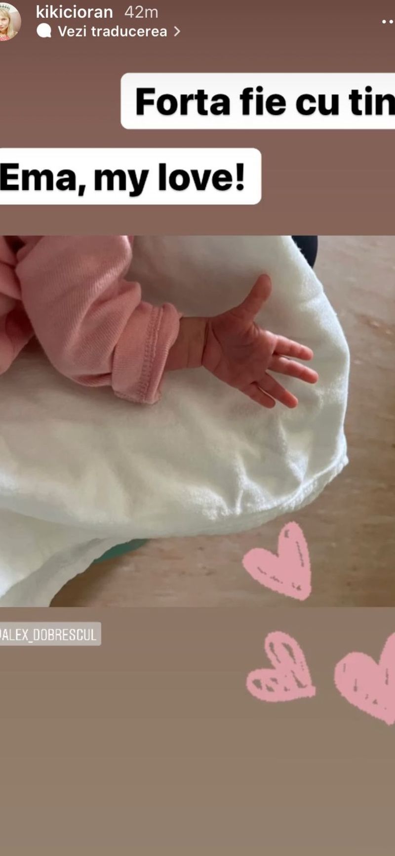 Totuși, aceste greutăți sunt acum de domeniul trecutului, iar pe rețelele de socializare, acolo unde i-a ținut pe internauți la curent cu tot ce se întâmpla atât pe parcursul sarcii, dar și după ce a născut, Cristina Cioran a postat prima fotografie cu fiica ei, Ema. Totodată, ea a transmis și un mesaj absolut emoționant pentru fiica ei: „Forța fie cu tine! Ema, my love (În traducere: iubirea mea)”.