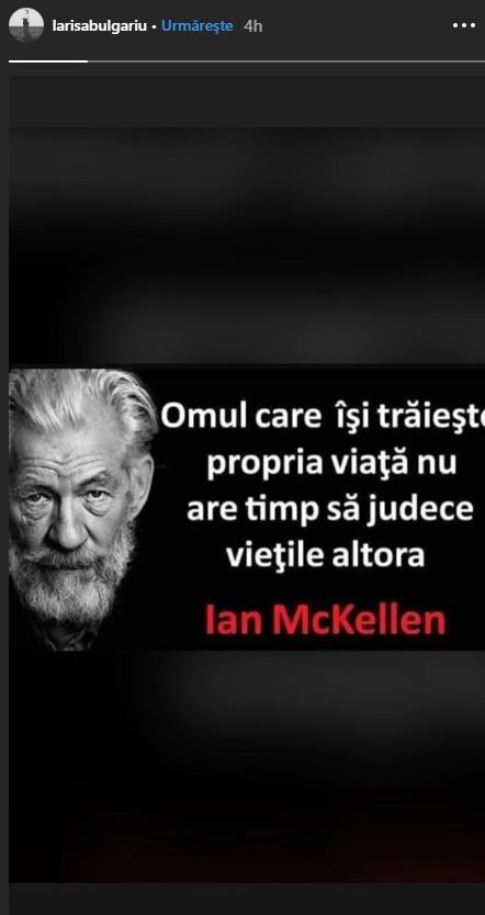 „Omul care își trăiește propria viață nu are timp să judece viețile altora- Ian McKellen”, este citatul cu care Larisa pare să rezoneze cel mai bine și pe care ea l-a distribuit.