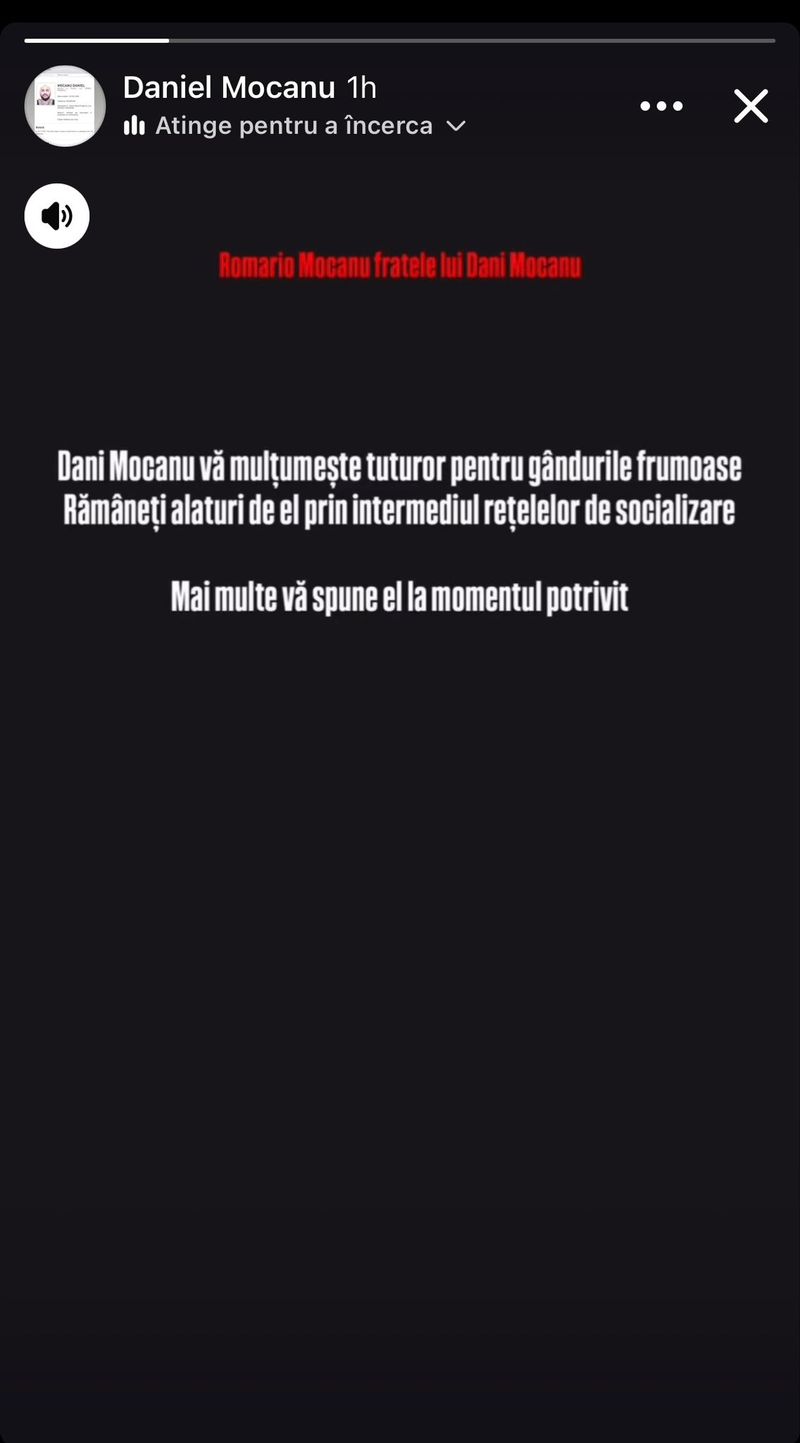 „Dani Mocanu vă mulțumește tuturor pentru gândurile frumoase. Rămâneți alături de el prin intermediul rețelelor de socializare. Mai multe vă spune el la momentul potrivit”, este mesajul apărut pe pagina de Facebook a lui Dani Mocanu și semnat de fratele său, Romario.