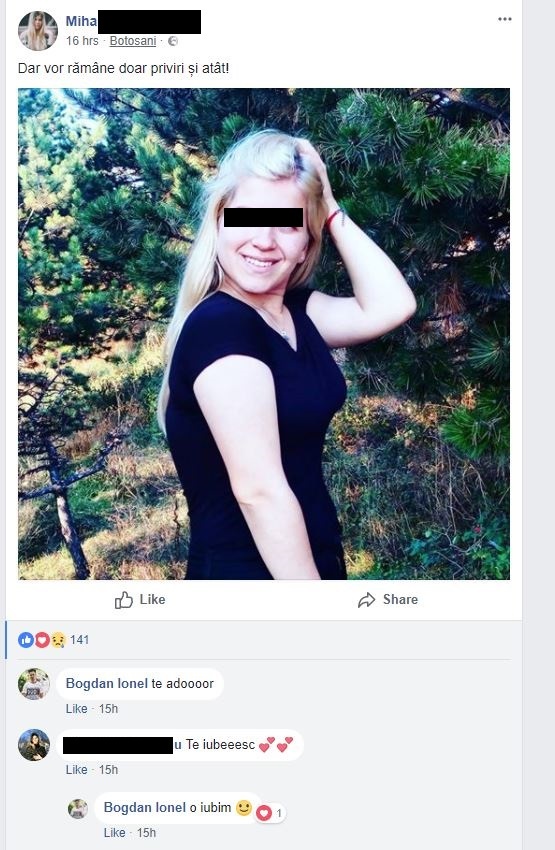 Ulterior, in urma acuzatiilor si jignirilor primite, Mihaela a decis sa-si stearga contul de Facebook si sa stearga toate declaratiile de dragoste pe care cei doi si le faceau in mediul online. La o zi de la descoperirea crimei, iubita lui Bogdan nu mai este de gasit in mediul virtual.