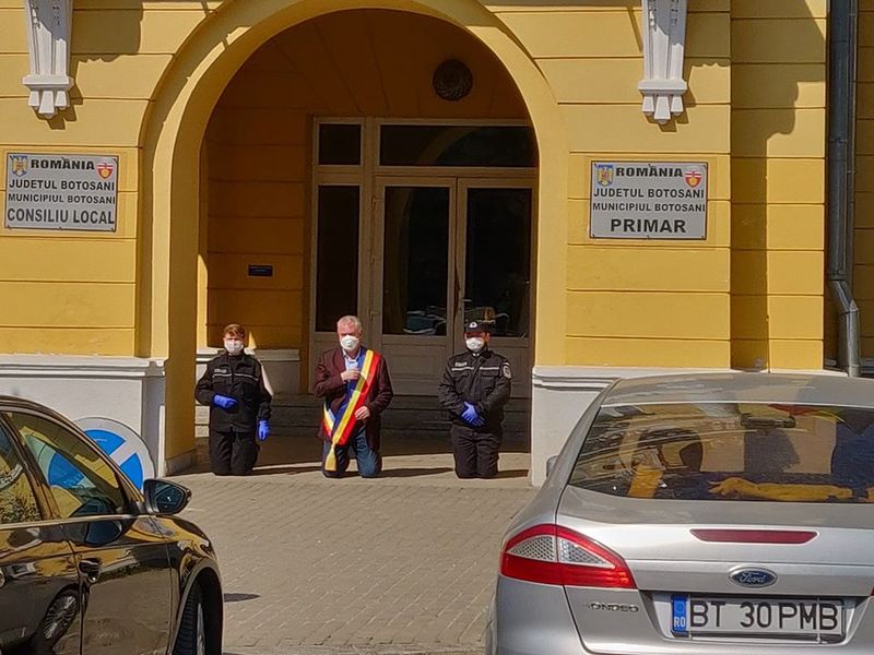 În momentul în care a trecut prin fața Primariei, edilul orașului a îngenuncheat pe asfalt, cu mască pe față, și a început să se roage.