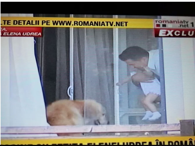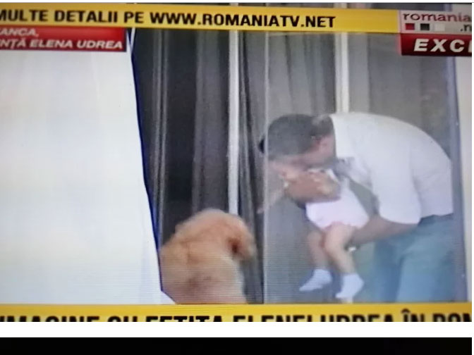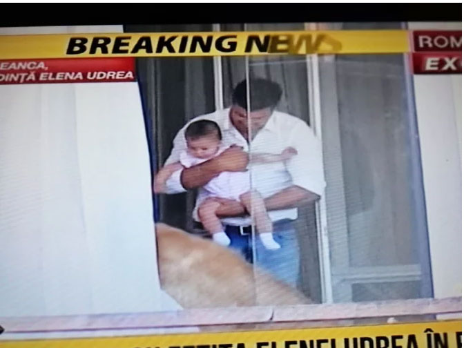 Fetița Elenei Udrea apare întâi cu bunica ei, apoi în brațele lui Adrian Alexandrov. Eva Maria a ieșit cu tăticul ei pe terasă și s-a jucat cu cățelul familiei, un superb exemplar de Golden Retriever.