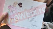 Pentru invitația la nuntă pentru domnișoara de onoare, Adelina Pestrițu a ales un scris de mână, frumos și cursiv, iar în stânga versurilor, două fete care se țin în brațe, de șolduri, una îmbrăcată în roz, iar alta în alb, fapt ce simbolizează prezența domnișoarei de onoare lângă mireasă.