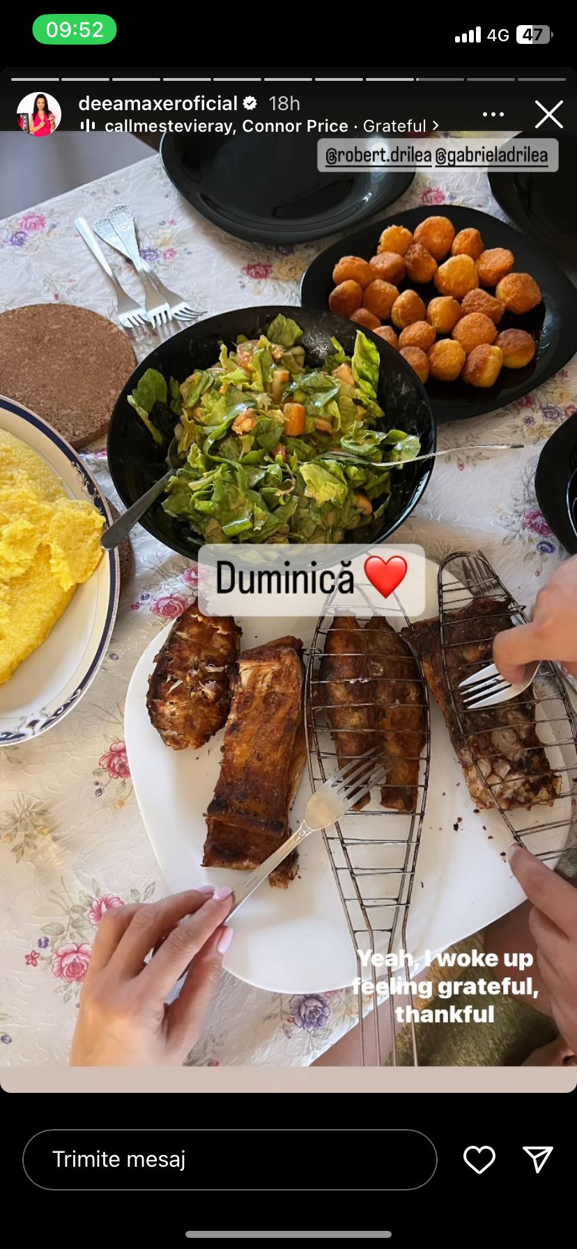 Deea Maxer are un program foarte încărcat tot timpul, însă în weekend preferă să meargă în vizite la persoanele dragi din viața sa alături de partenerul ei. Dacă în urmă cu câteva zile fosta soție a lui Dinu s-a văzut cu mama sa în oraș, de această dată ea și Robert Drilea au mers acasă la mama celui din urmă menționat. Se pare că artista are o relație foarte bună cu viitoarea sa soacră, arătându-le admiratorilor săi din mediul online de ce tratament a avut parte acasă la iubitul ei.
