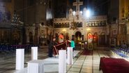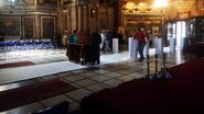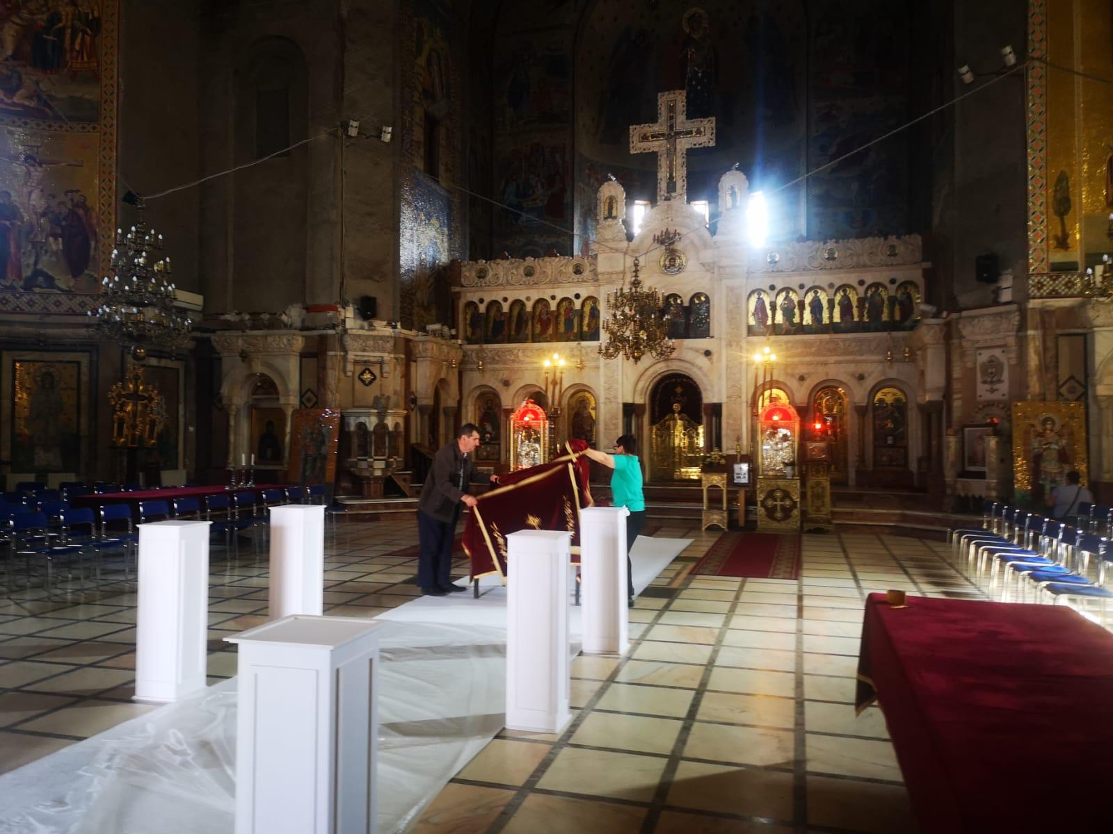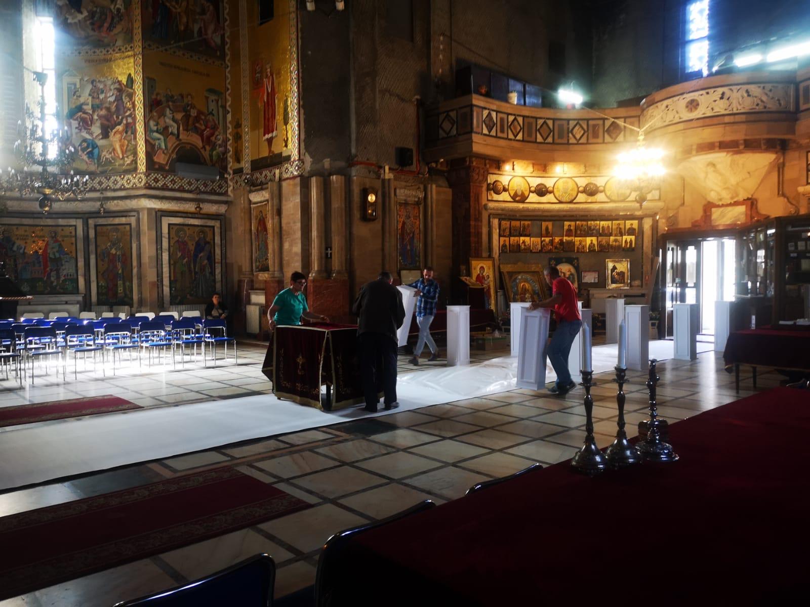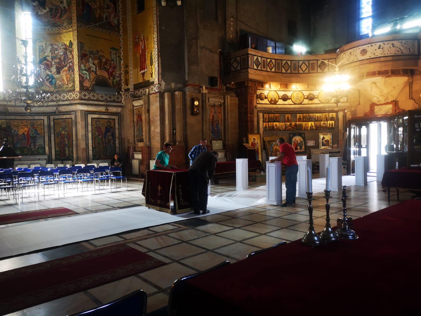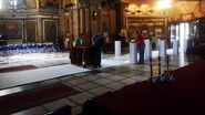 Și interiorul bisericii este shimbat. Au fost montate mici coloane albe pe care sunt așezate flori, iar pentru invitații la botez au fost aduse scaune.